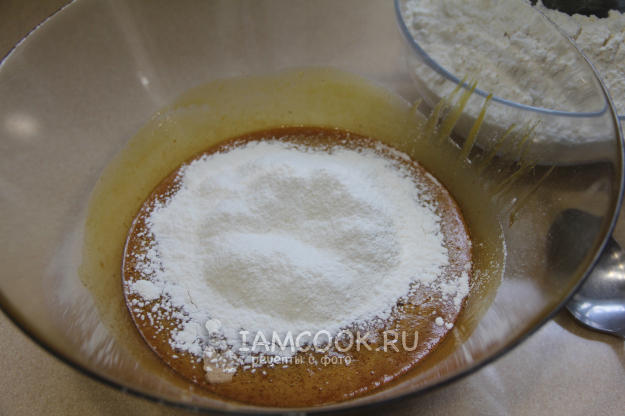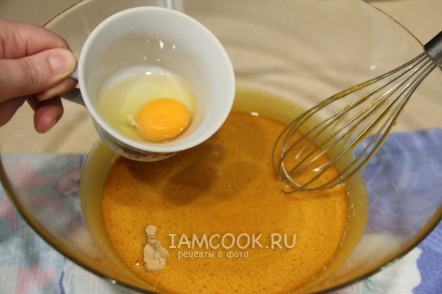 Перелить медовую основу в миску и остудить минут 10-15. Затем добавить яйца по одному и перемешать массу.