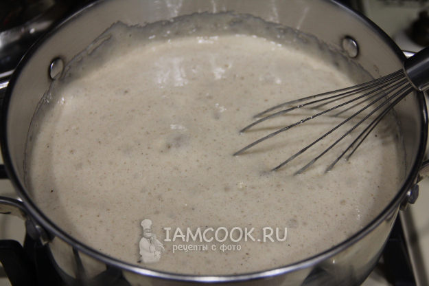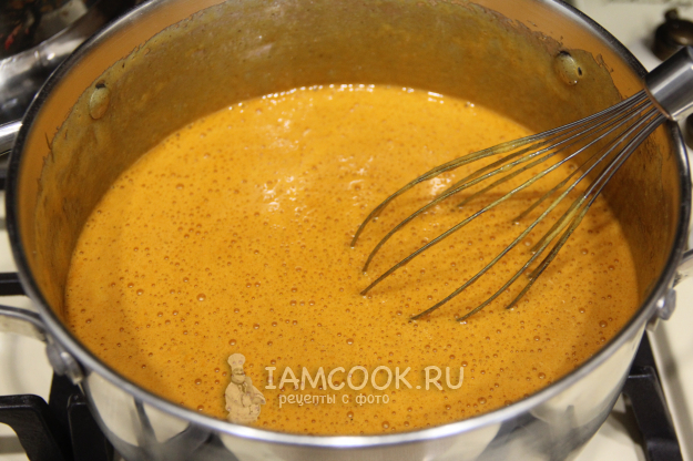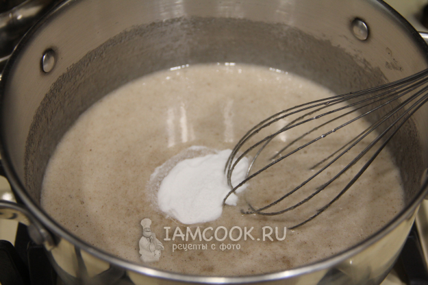 Перемешать массу венчиком и поставить на огонь. Довести массу до кипения. В горячую массу всыпать соду и перемешать венчиком.