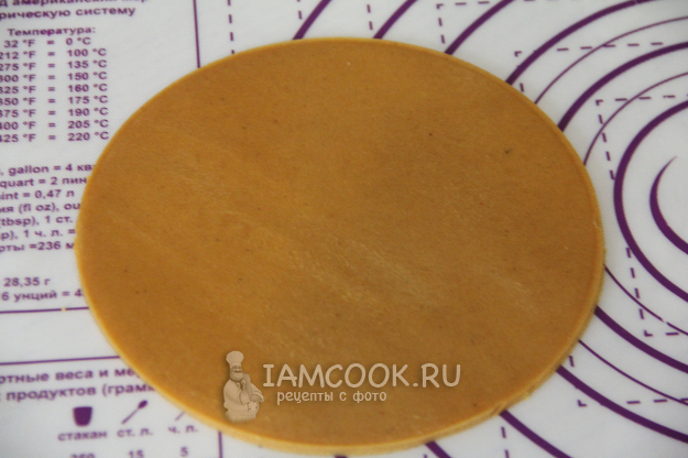Тесто достать из холодильника и раскатать скалкой толщиной примерно 4 мм. Вырезать из теста коржи диаметром 20 см.