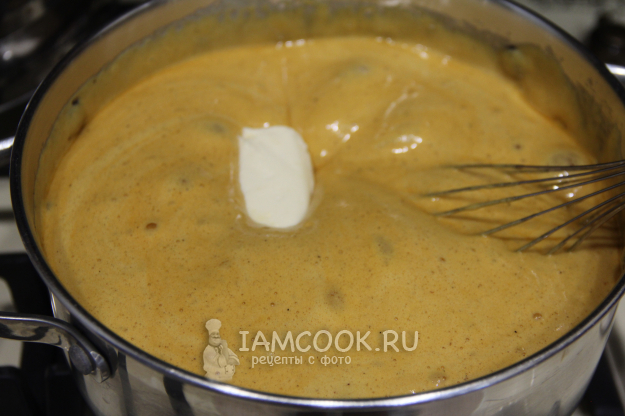 Помешивая, довести массу до кипения и томить пару минут, до карамельного цвета. Добавить мягкое масло в кастрюлю.
