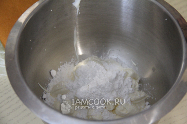 Сливки выложить в чашу миксера и добавить сахарную пудру.