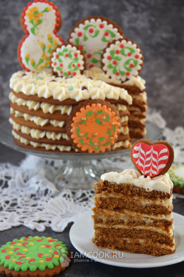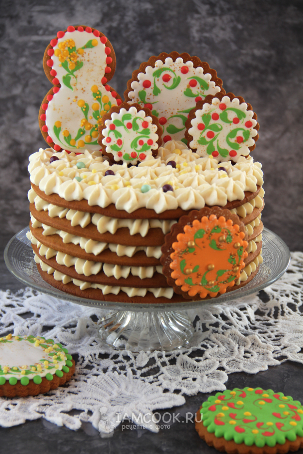 Украсить верх торта кремом и, конечно, нашими красивыми пряниками. Посмотрите, какой красивый торт получился.