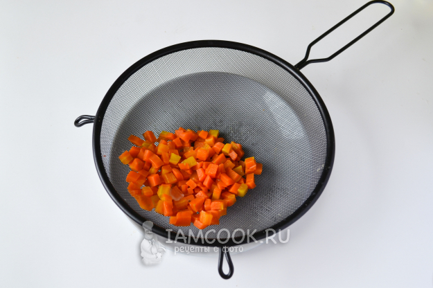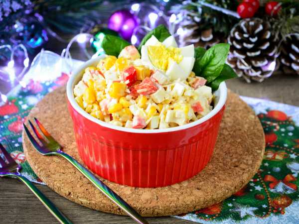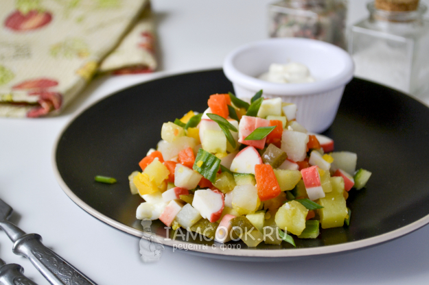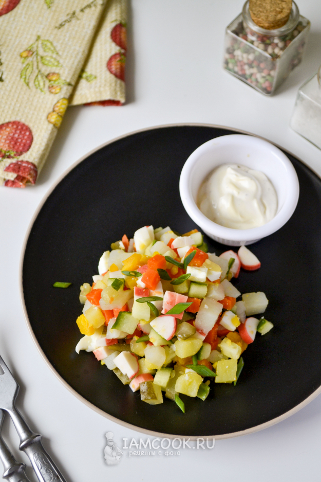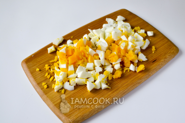 Крабовые палочки освободите от пленочной упаковки и нарежьте кубиком.
