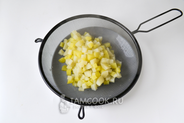 Вареную картошку переложите в сито, чтобы полностью остыла и стекла вода.