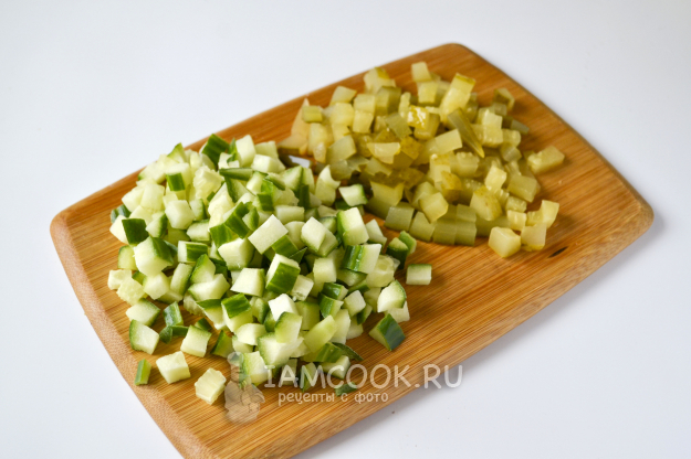 Свежий и маринованный огурец нарежьте такими мелкими кубиками.