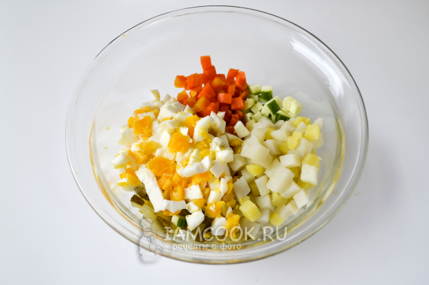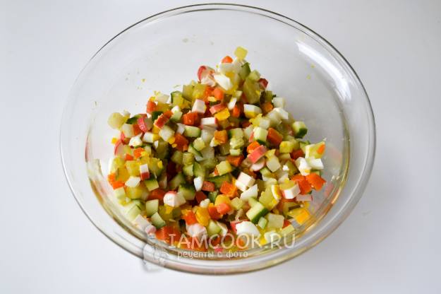 В салатник положите нарезанные продукты: яйца, огурцы, картофель, морковь и крабовые палочки.