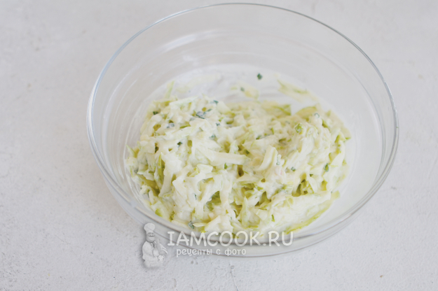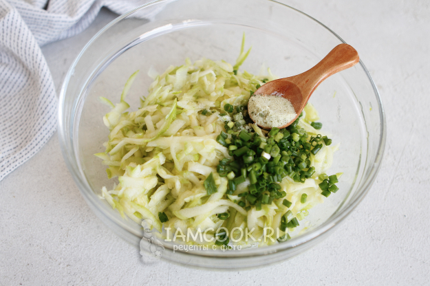 Лук зеленый сполосните, обсушите и мелко нашинкуйте. Добавьте специи по вкусу. Я добавляла соль с травами, но совсем чуть-чуть. Перемешайте все ингредиенты и оставьте на пару минут. Если кабачок отдаст сок, соберите его ложкой.