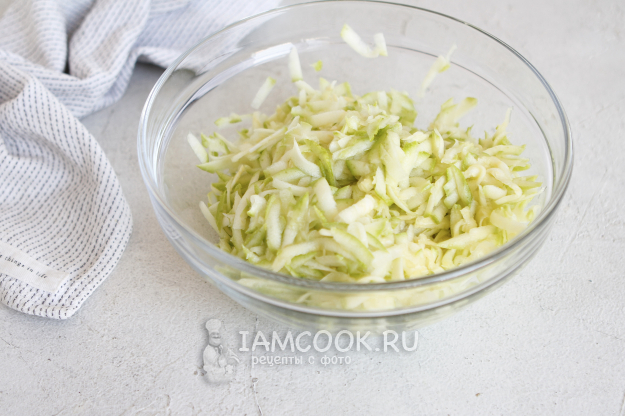 Натрите кабачок на терке. И хорошо его отожмите. Для удобства сито застелите марлей, переложите в него кабачок. Скрутите марлю и отожмите кабачок.