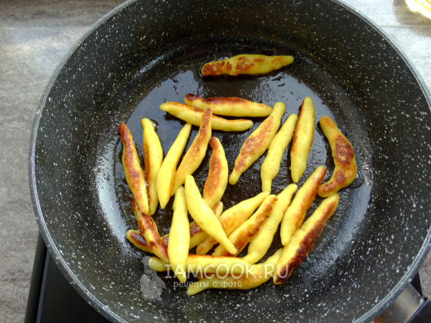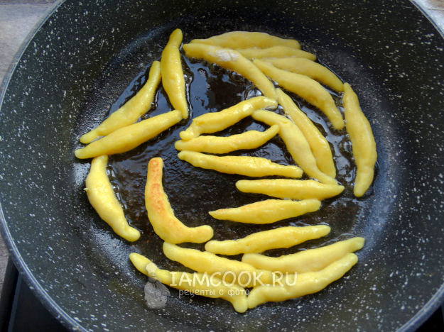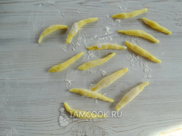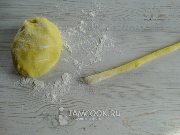 Нарезать жгут небольшими кусочками и прокатать на припыленном мукой столе так, чтобы края были чуть тоньше, а серединка - толще.