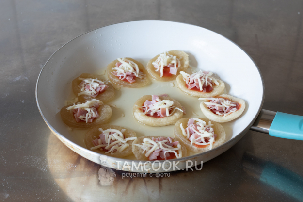 Снимем сковороду с огня, перевернём мини-пиццы. Если есть пузыри - проткнём их, просто надавив на вздувшиеся пластинки.