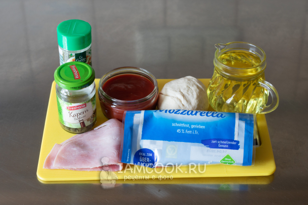 Подготовим ингредиенты для жареной пиццы. Для этого соберём всё, что найдётся в вашем холодильнике на тему пиццы. Тесто у меня вот это - классическое неаполитанское, но, по-моему, должно подойти любое дрожжевое. Кроме теста, обязательно нужен ещё сыр и что-нибудь томатное. На худой конец сойдёт даже кетчуп.