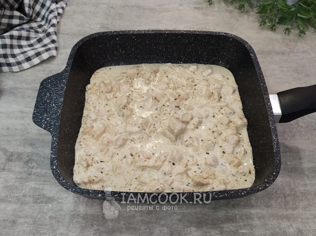 Нагрев убавьте до слабого, влейте сливки, тушите до готовности курицы, минуты 2-3 (готовность проверяйте, разломив кусочек, крови нет - готово).