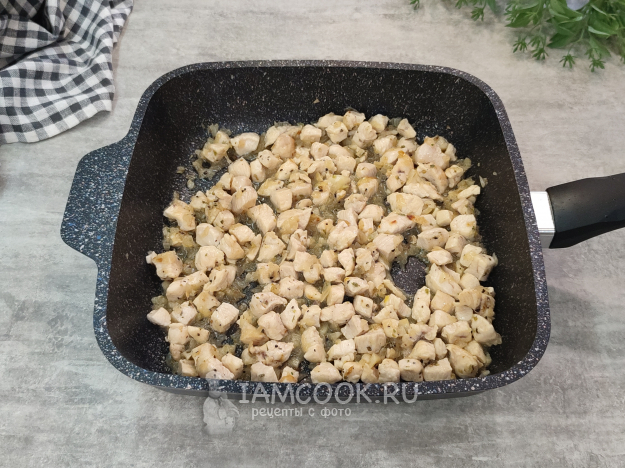 Добавьте к луку и чесноку кусочки курицы, обжарьте, помешивая, до изменения цвета мяса. По вкусу приправьте, я добавила соль, черный перец и пару щепоток сухого орегано.