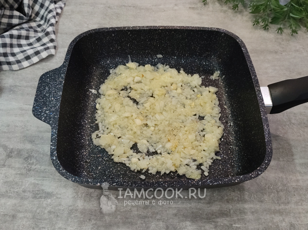 В сковороде разогрейте масло, обжарьте лук и чеснок до легкой румяности.