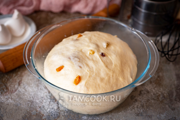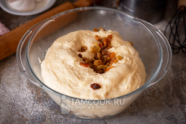 Приступаем к приготовлению булочек. Добавьте в тесто изюм, вмешайте его.