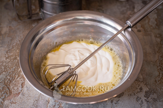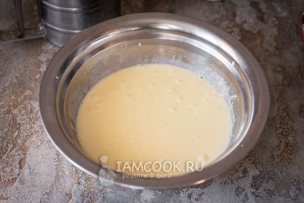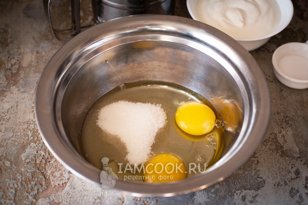 За это время приготовьте сдобную смесь. В миску вбейте яйца и добавьте оставшийся сахар. Перемешайте.