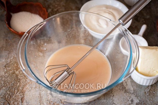 Залейте теплую воду и хорошенько все размешайте венчиком.