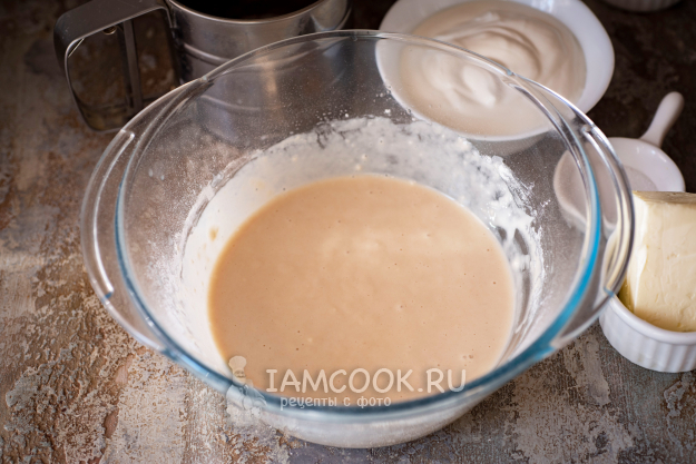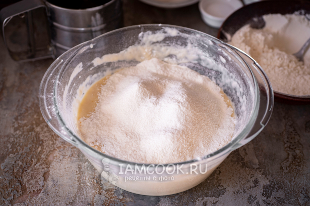 Сдобную смесь залейте в миску к опаре. Перемешайте.