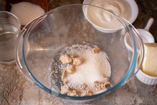 В просторную миску пальцами разотрите прессованные дрожжи, добавьте столовую ложку сахара.
