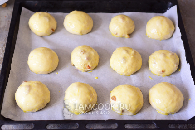 От общей массы теста отделяйте небольшие части (весом примерно по 70 г) и формируйте шарики-заготовки, выкладывайте на противень, застеленный пергаментом для выпекания. Каждую заготовку смажьте смесью взболтанного яичного желтка и 1 ч.л. воды.