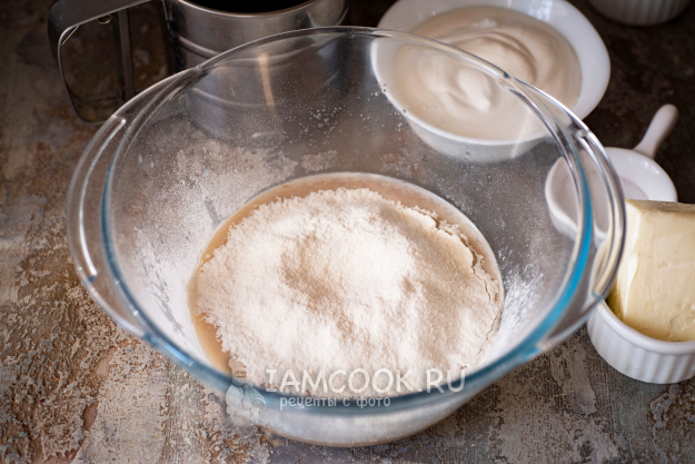 Начинайте частями просеивать муку и сначала вмешивайте ее ложкой, после уже приступайте к замесу руками.