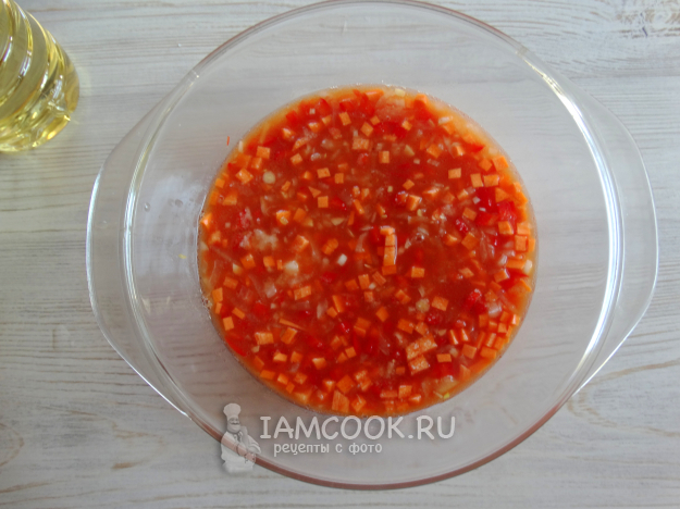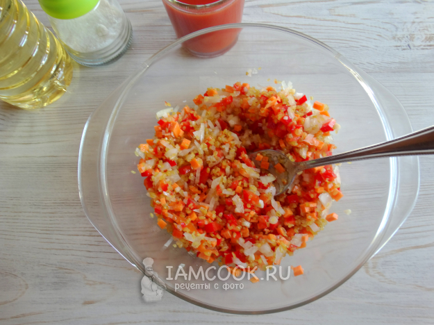 Овощи нарезать мелким кубиком, чеснок измельчить, сложить в форму для запекания.