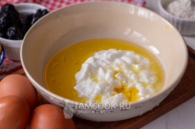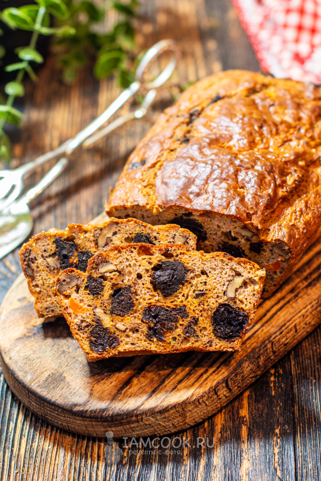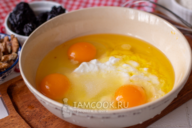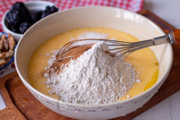 Чернослив замочите в теплой воде на 5-7 минут, затем промойте и обсушите. Нарежьте его на небольшие кусочки. Грецкие орехи порубите ножом на кусочки. Добавьте в тесто орехи и чернослив. Хорошо перемешайте тесто.
