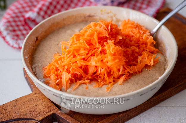 Морковь очистите и натрите на мелкой терке. Добавьте ее в тесто.