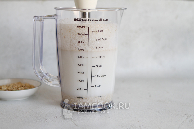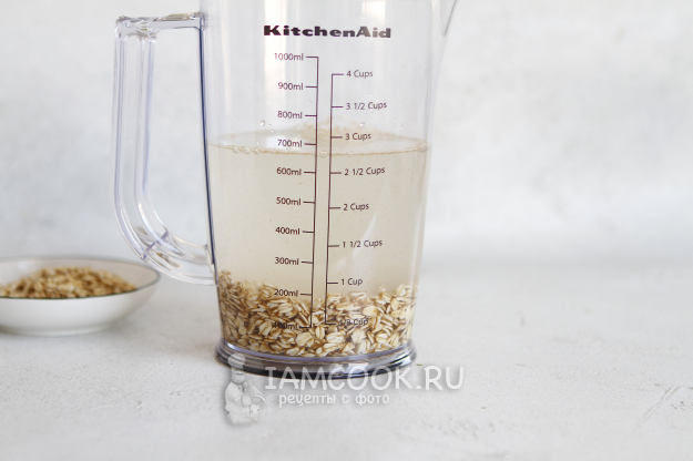 В стакан блендера отправляем овсяные хлопья (70 г), добавляем 700 мл питьевой воды.