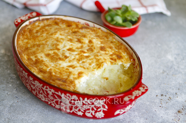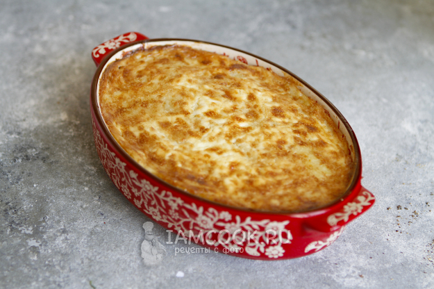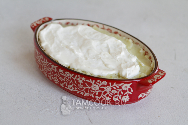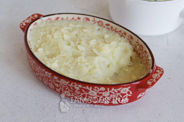 Подготовьте подходящую форму для запекания, слегка смажьте ее маслом. Выложите картофельное пюре с луком в форму.