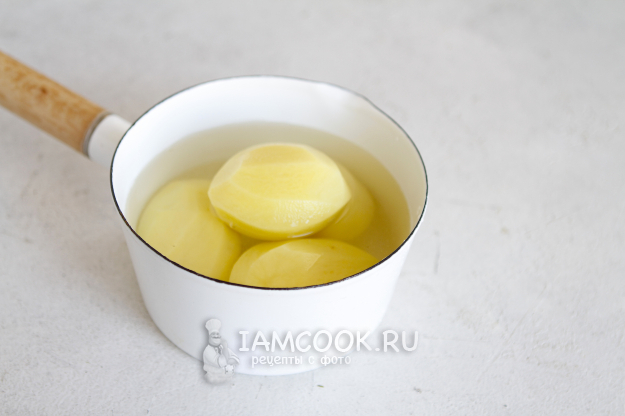 Итак, картофель у нас готов, теперь необходимо его отварить. Подберите подходящую посуду, переложите в нее клубни картофеля, залейте водой. Воду доведите до кипения, посолите и варите картофель на среднем огне до готовности.