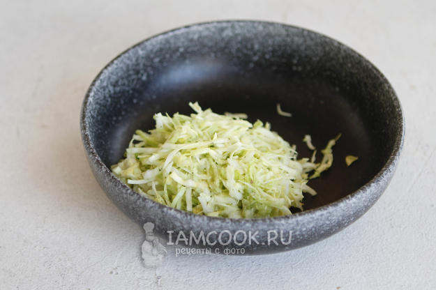 Свежую капусту нашинкуйте как можно тоньше, немного посолите и помните ее руками.