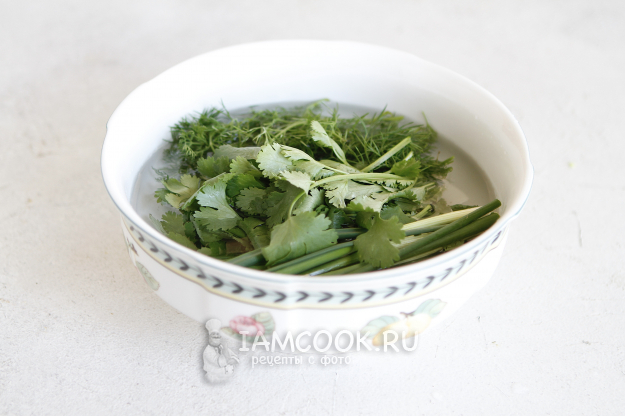 Всю свежую зелень: кинзу, укроп и зеленый лук замочите в воде на 10 минут, чтобы отмокли приставшие к зелени земля с песком. Затем промойте еще раз под проточной водой, переложите в дуршлаг, чтобы стекла вода. Обсушите бумажным полотенцем.