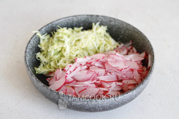 Редиску промойте, срежьте хвостики и обсушите. Если кожура горчит, то рекомендую ее снять. Нарежьте ее тонкой соломкой (удобнее это сделать на терке для корейской моркови).