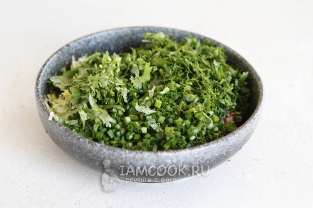 Всю зелень измельчите. Я еще люблю добавлять свежий чеснок, но в этот раз в холодильнике его не было.