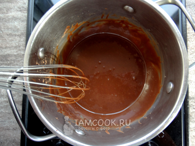 Поставить на огонь и, постоянно помешивая, соединить все ингредиенты. Кипятить глазурь не надо! С шоколадом глазурь получается средней густоты, в самый раз.