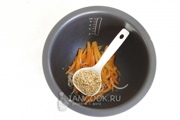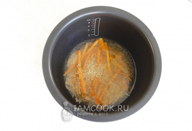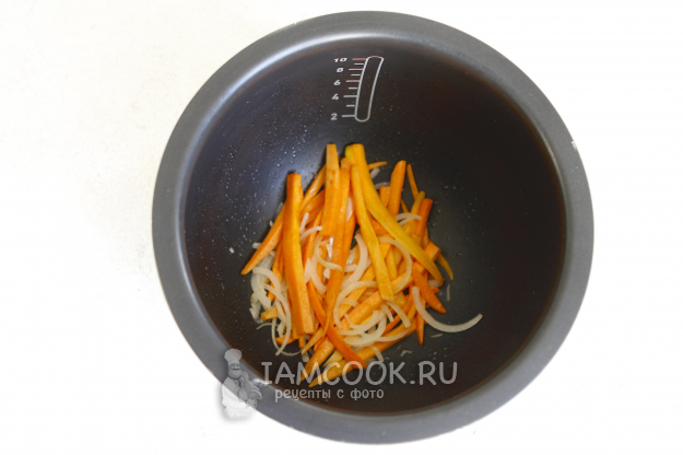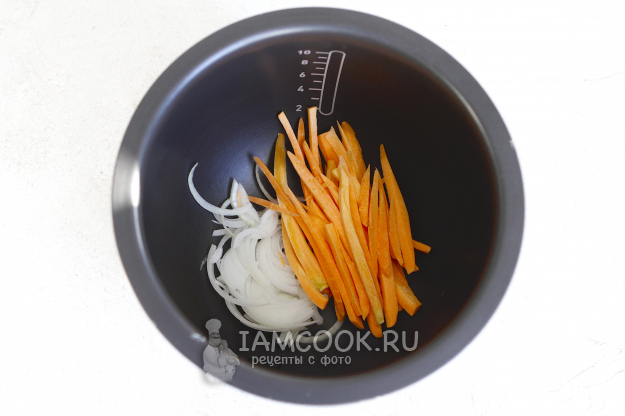 В чашу мультиварки влейте растительное масло, добавьте овощи.