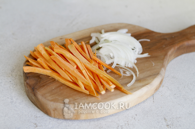 Лук репчатый, морковь почистите и сполосните. Лук нарежьте полукольцами, морковь - брусочками.