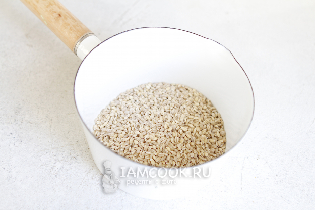 Подготовьте перловую крупу, переберите ее и тщательно промойте под проточной водой. Откиньте на дуршлаг.