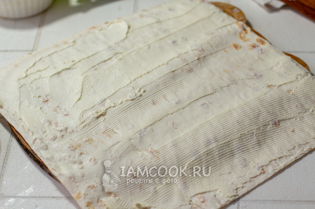 Лист лаваша смажьте тонким слоем творожного сыра.
