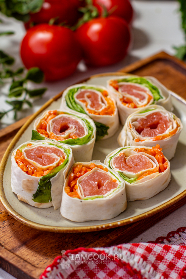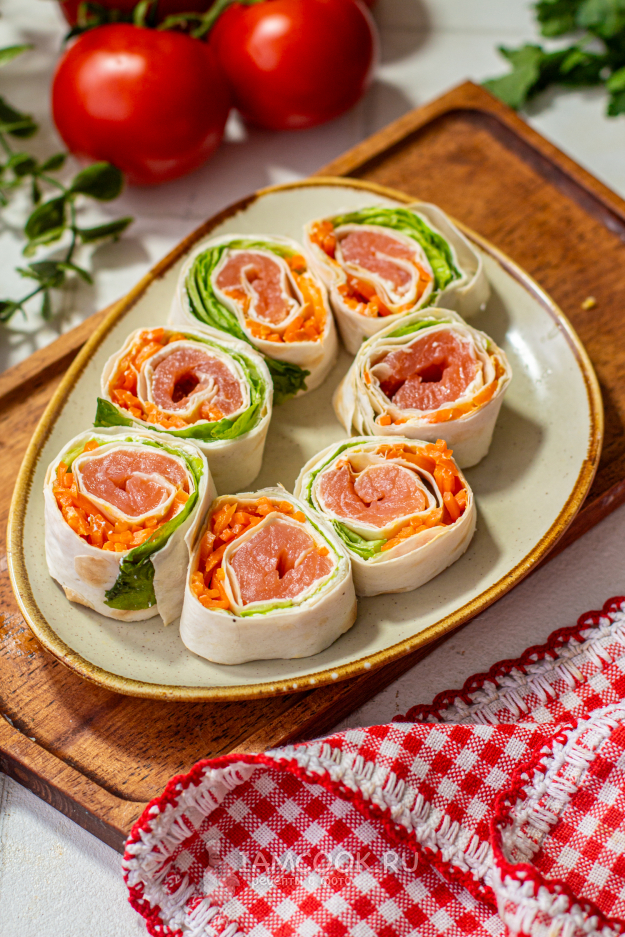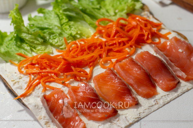 Листья салата промойте и обсушите. На лаваш разложите листья салата, морковь и рыбу.