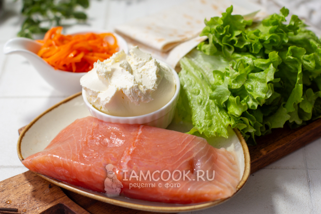 Соберите необходимые продукты для приготовления рулета «Светофор» из лаваша с красной рыбой. Идеальным вариантом для начинки рулета из лаваша станет красная рыба домашнего посола: она более нежная и сочная, нежели магазинная.