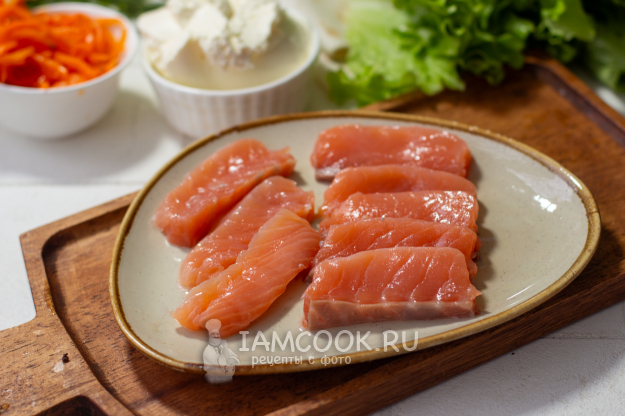 Слабосоленую красную рыбу выложите на доску, нарежьте тонкими длинными пластинами, а не кубиками, так как в этом случае она будет выпадать из рулета.