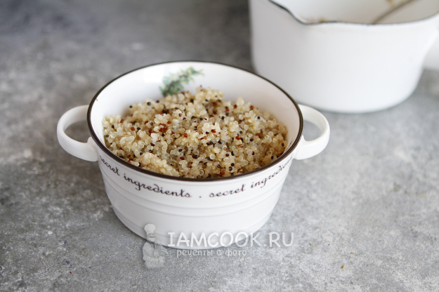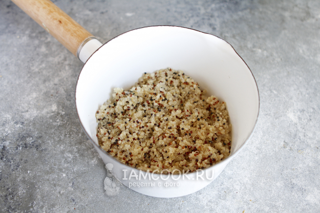 Киноа готова, дайте ей полностью остыть. Выложите в чашу.