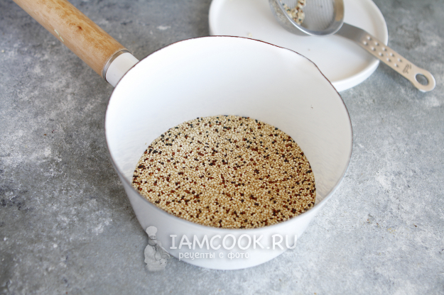 Тщательно промойте киноа, откиньте на дуршлаг. Переложите в сотейник или небольшую кастрюлю и влейте воду.