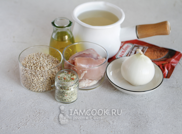 Соберите все продукты по списку и приступим к приготовлению перловой каши с курицей на сковороде.