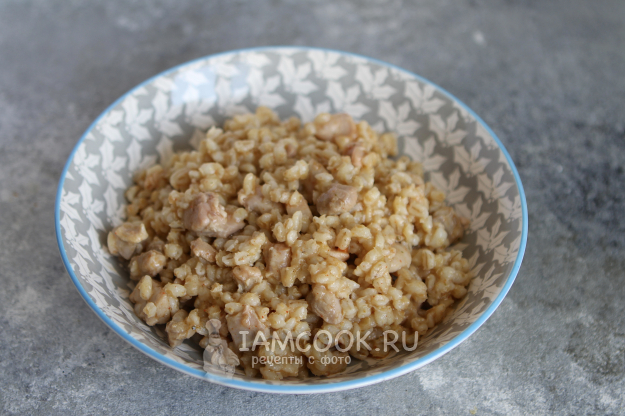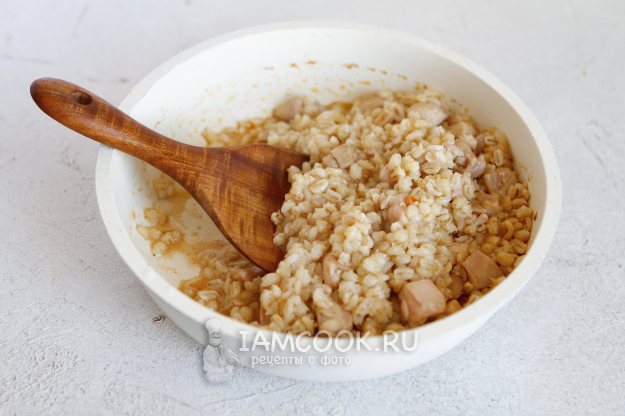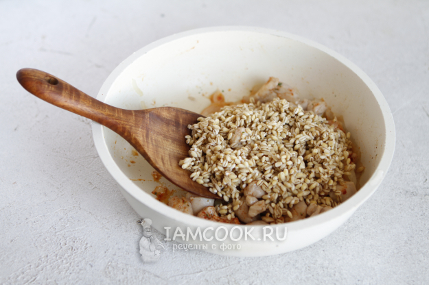 Откиньте перловку на сито, дождитесь, чтобы стекла вся вода, и затем добавьте ее в сковороду.