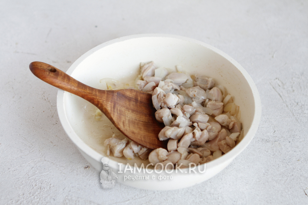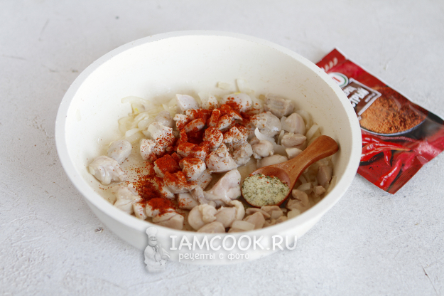 Добавьте кусочки курицы и продолжите обжаривать ее вместе с луком еще примерно 5-7 минут.