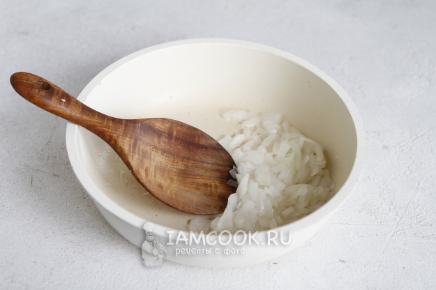 Головку репчатого лука почистите и нарежьте квадратиком. Разогрейте сковороду с растительным маслом и припустите лук до мягкости.