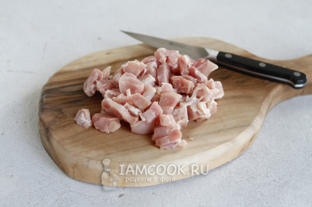 Итак, мясо курицы: в моем случае это бедренная часть без кожицы, промойте под проточной водой, обсушите на бумажном полотенце и нарежьте так, как нравится вам.